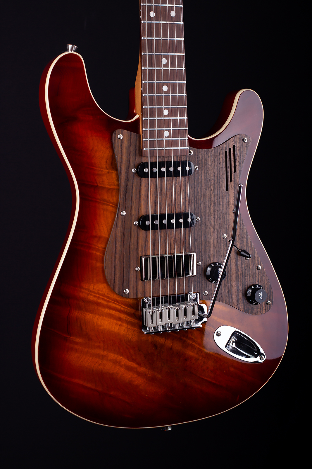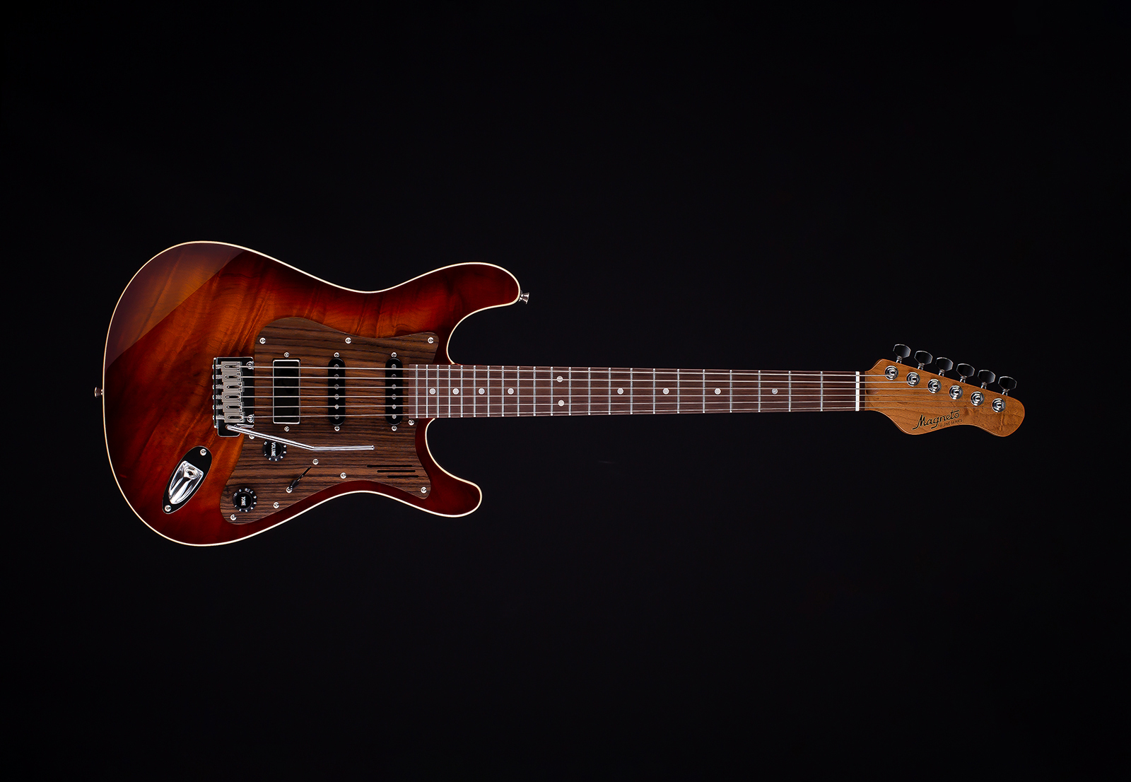 The Sonnet Supreme is based on the Magneto Sonnet Shape made out of a Basswood body adorned with a unique figured Laurel drop top. The Floating Tremolo combined with a set of staggered locking tuners and a bone nut ensures best string vibrations. The neck is made of a brown colored Roasted Maple with a Rosewood fingerboard.