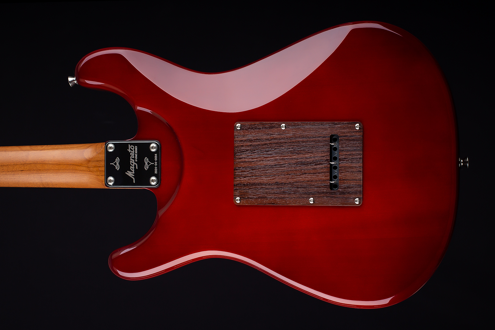 The Sonnet Supreme is based on the Magneto Sonnet Shape made out of a Basswood body adorned with a unique figured Laurel drop top. The Floating Tremolo combined with a set of staggered locking tuners and a bone nut ensures best string vibrations. The neck is made of a brown colored Roasted Maple with a Rosewood fingerboard.
